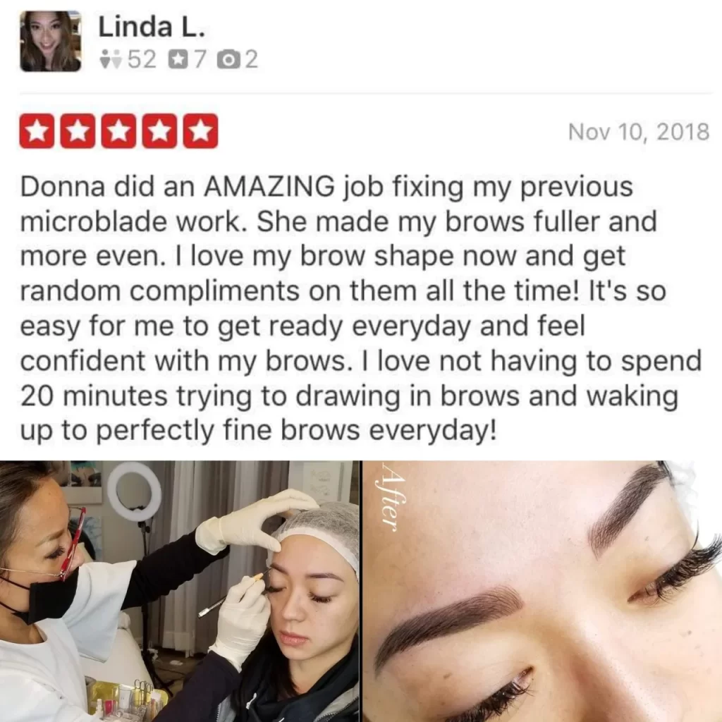 Donna is an artistic pioneer in the field of permanent makeup. She has over 15 years of experience in giving her clients confidence in their beauty. She is a Licensed Artist Operator of Permanent Cosmetics in the states of Washington and California by Westminster Advanced Institute, certified for Permanent Make-up and Eyelash Extension, and focuses on the importance of a sanitary working environment as well as the personalized needs of her clients. She currently has over 4000 satisfied clients. She consults with each client and considers bone structure and personal preferences before their procedures are done to ensure they receive the results they expect. The black won’t turn blue and the brown won’t turn red.
